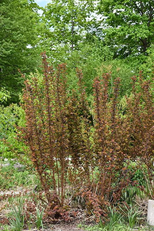 Quite the colorful shrub, this garden beauty with neat compact branching, produces dark crimson red leaves, which sets off the white flowers spectacularly; leaves mature to dark purple in fall; a large variety that will grow nearly anywhere