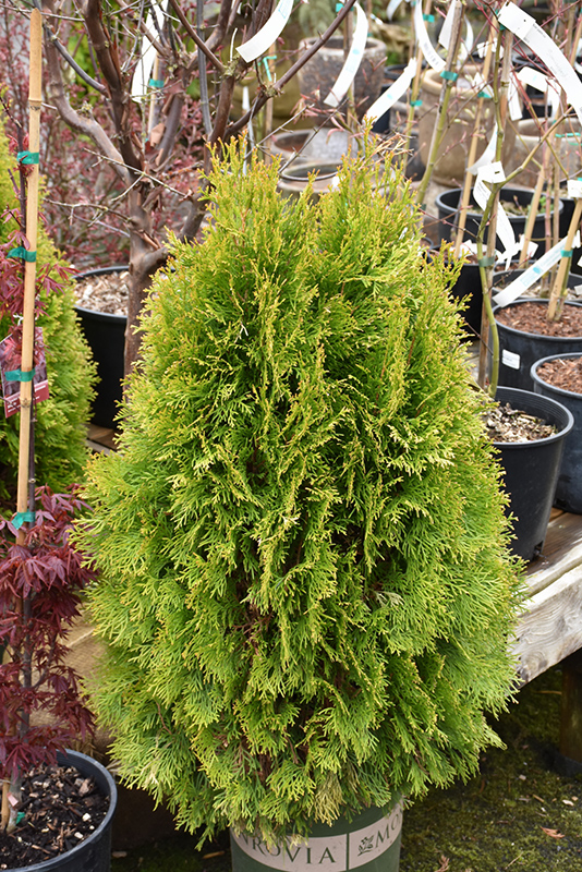 A tightly pyramidal evergreen for home landscape use, featuring yellow juvenile foliage that turns gold in winter; excellent for vertical emphasis, hardy and adaptable, takes pruning well; best with some sun, protect from drying winds