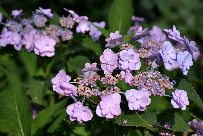 An attractive, re-blooming shrub featuring showy white to light-pink lacecap flowers with creamy centers, that turn more blue in acid soil; re-blooms on new and old wood; deep green leaves turn burgundy in fall