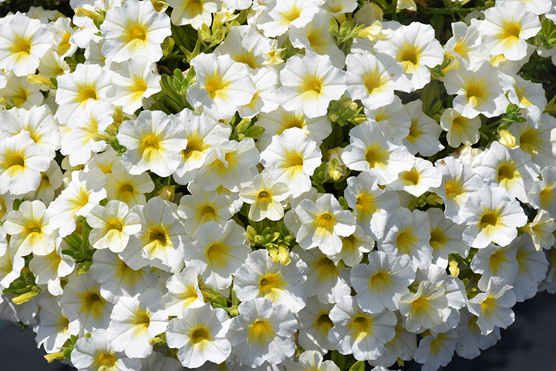 Superbells® Over Easy™ Calibrachoa is blanketed in stunning white trumpet-shaped flowers with yellow throats at the ends of the stems from late spring to early fall, which emerge from distinctive buttery yellow flower buds. Its small pointy leaves remain green in colour throughout the season.