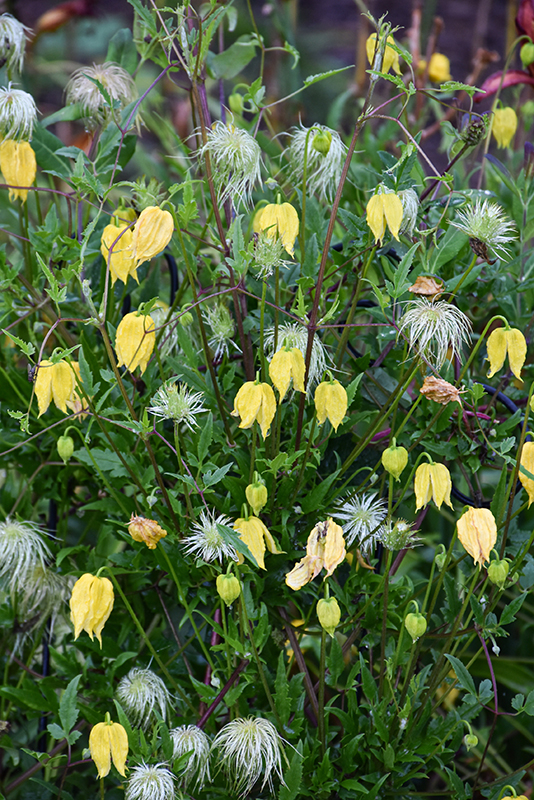 A distinctive variety of the popular climber with nodding golden flowers in mid summer followed by showy plumes of white fluffy "fruit" in fall, loves to climb and puts on a dazzling performance